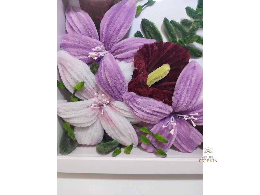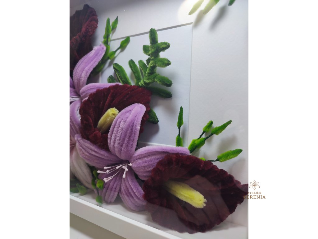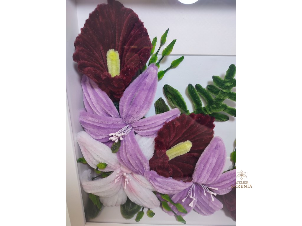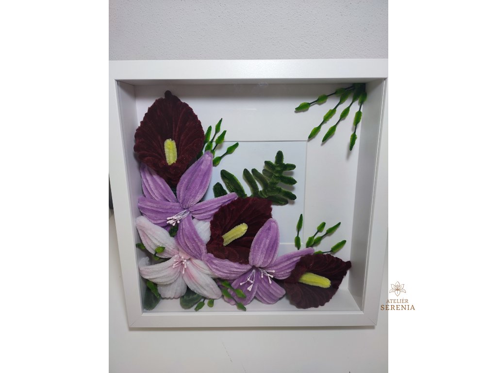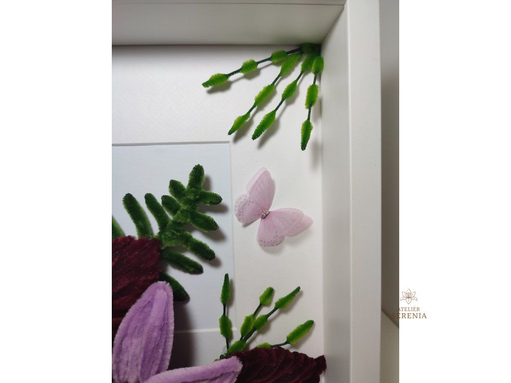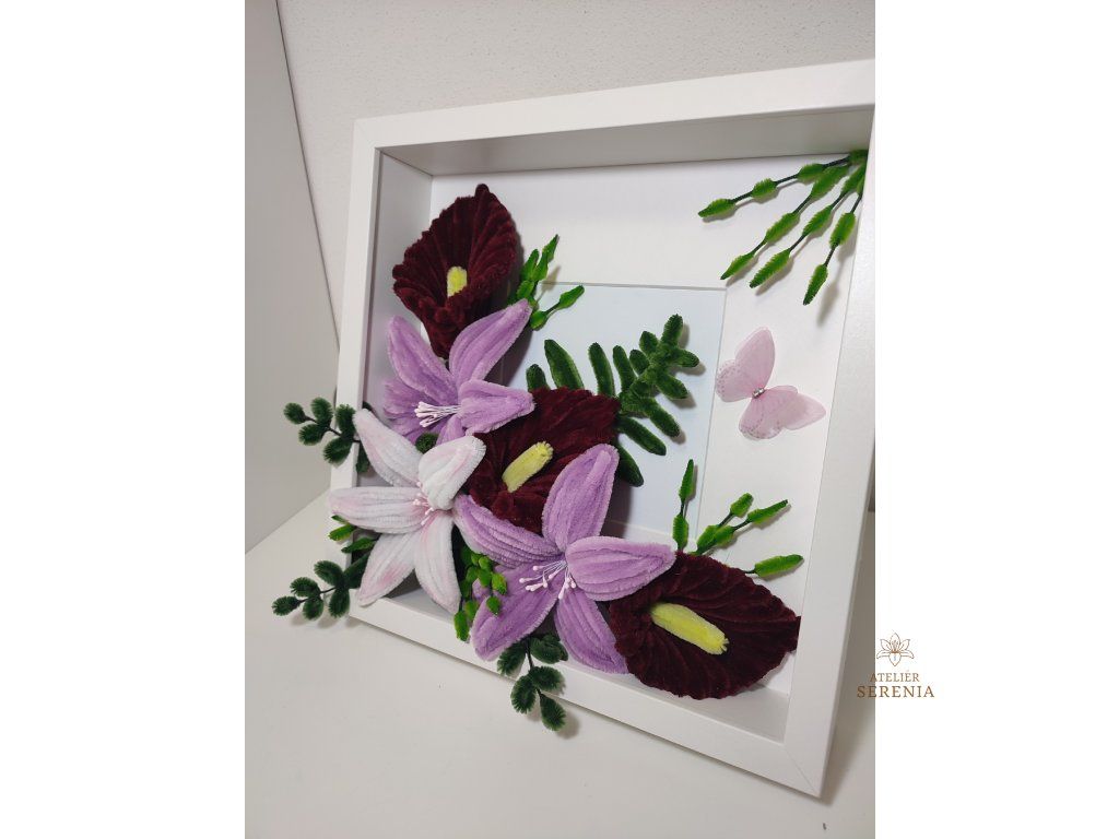 Obraz Purpurová harmonie je jedinečná květová dekorace, která spojuje umění květinového aranžmá s jemností runě zpracovaných materiálu. Nalezneme zde pečlivě sestavenou kompozici prolínající fialové, vínové a růžové tóny barev, doplněné o jemné odstíny zelené. Jemnost a kontrast barev podtrhuje bíle zvolený rám, vyvolávající pocit elegance a moderny.