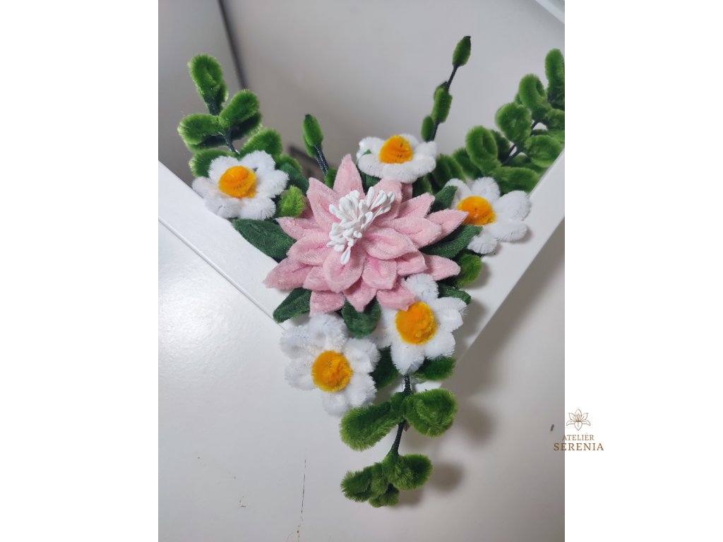Květiny - chlupatý drátek (čistič dýmek) - tvořený železným drátkem a nylonem, floristická páska, dozdobený střed vyroben z plastu. Materiál - země původu Čína. Některé květiny obsahují domalování prašnými stíny nebo suchým pastelem.